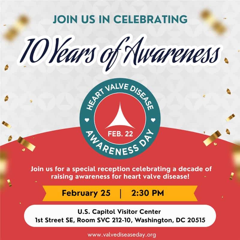 Heart Valve Disease Awareness Day activities involve heart screenings with stethoscopes, story sharing, educational events, social media campaigns, and more. The Alliance will celebrate 10 years of disease awareness with a Celebratory Reception at the U.S. Capitol Visitor Center on February 25. RSVP to attend.